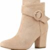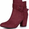 - [ FEATURES ]: Heel Ankle Boots; Chunky Heel; Buckle Decor; Round Toe; Block Heel; Side Zip